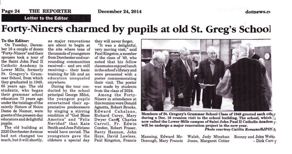 burial at St. Mary's Cemetery in Needham. Gratefully, Dick Carey reported that, in addition to himself, the class was represented by Peter McDonald, John McLaughlin, and Jim & Dottie Kelly.